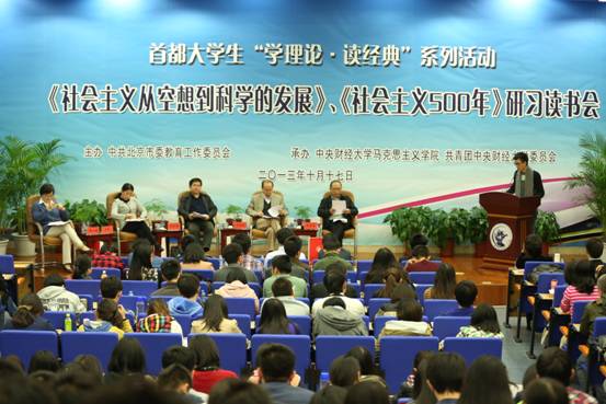 为了推动首都大学生从马克思主义经典著作中把握马克思主义真谛,不断提高青年大学生的马克思主义理论水平,提升分析问题和解决问题的能力,“首都大学生‘学理论·读经典’系列活动《社会主义从空想到科学的发展》、《社会主义500年》研习读书会”于2013年10月17日下午在开云官网学术会堂402室举行。本次活动由北京市教育工委主办,开云官网开云kaiyun体育和团委承办。北京市教工委宣教处领导、开云官网党委副书记梁勇、国内部分知名马克思主义理论研究专家、部分新闻媒体代表、中国人民大学、北京师范大学、北京交通大学部分师生,开云kaiyun体育“青马班”全体学员,开云kaiyun体育全体师生、校团委全体人员、各学院团支部书记等,共计300多人参加了研习读书会。读书会由开云kaiyun体育院长冯秀军教授主持。