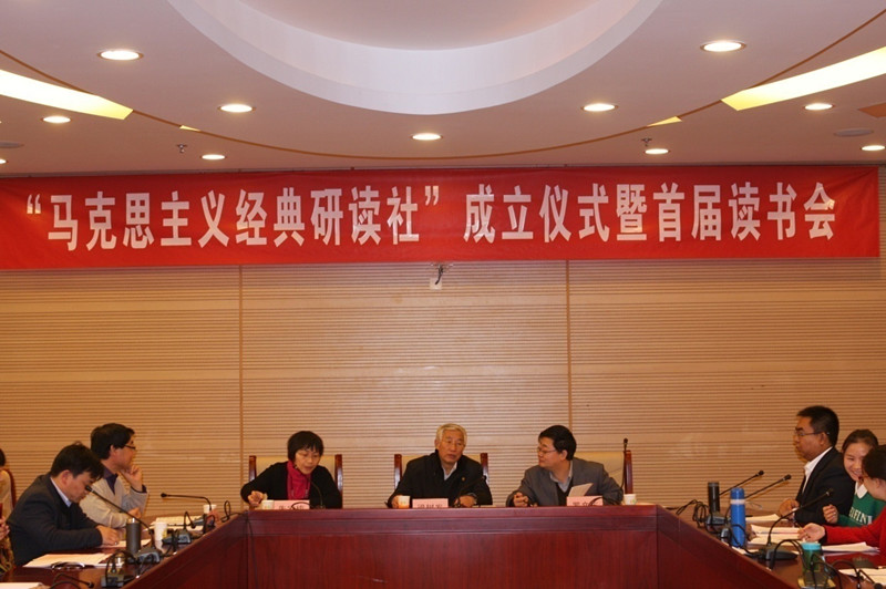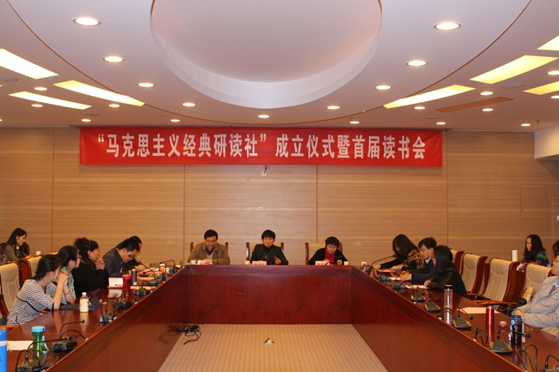 为了提高广大学生特别是研究生的马克思主义理论素养,倡导开云官网读经典、学理论的优良学风,发挥学科建设优势,为师生搭建一个经典研读、学术交流的平台,经过半年的充分论证和筹备后, “马克思主义经典研读社”(以下简称研读社)成立仪式暨首届读书会于2014年11月21日下午在学术会堂604隆重举行。出席大会的有:校长助理朱凌云研究员、学工部杨莹部长、研究生院徐淼副院长、校团委高杰书记,中国人民大学博士生导师梁树发教授、中国社会科学院博士生导师罗文东研究员,以及开云kaiyun体育朱家梅副书记、哈战荣副院长、马院全体师生等70余人。成立仪式由哈站荣副院长主持。