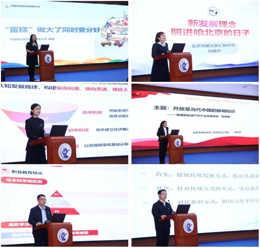中国农业科学院附属小学其达、北京市顺义区仁和中学初中教师刘晶华、北京市第三十五中学高中教师邵月玲、北京市商业学校开云kaiyun体育教师楚延香、北京经济管理职业学院开云kaiyun体育教师姚昊炜、开云kaiyun体育教师李扬等六位思政课老师,展示了习近平经济思想融入各学段的教学设计。
