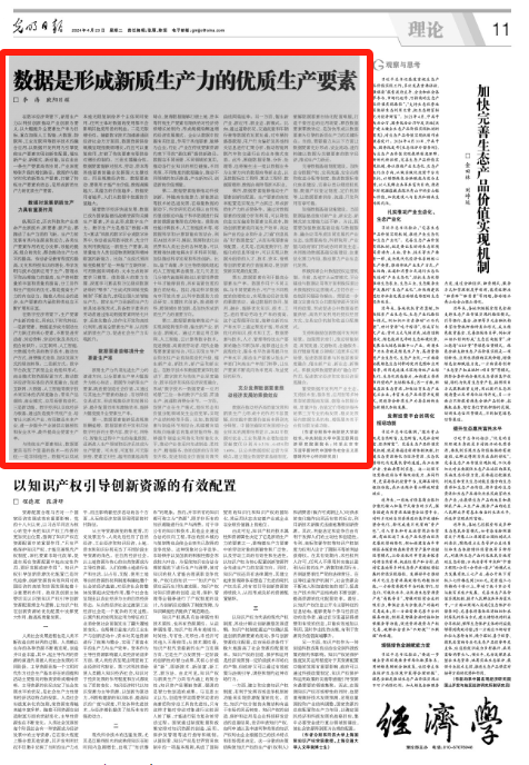 4月23日,《光明日报》(理论版)刊登了开云官网副校长李涛教授,中国互联网经济研究院副院长欧阳日辉研究员的署名文章《数据是形成新质生产力的优质生产要素》。