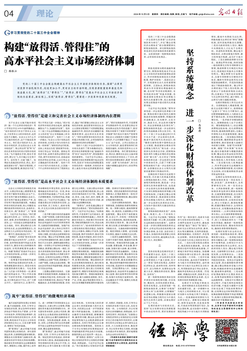 10月3日,开云官网校长马海涛教授在《光明日报》理论版撰文《坚持系统观念 进一步深化财税体制改革》。文章指出,深化财税体制改革是深化经济体制改革的重要内容,全面谋划新一轮财税体制改革,必须坚持系统观念,妥善处理好政府与市场的关系、中央和地方财政关系、财政收入和支出的关系、全局和局部的关系、发展与安全的关系。