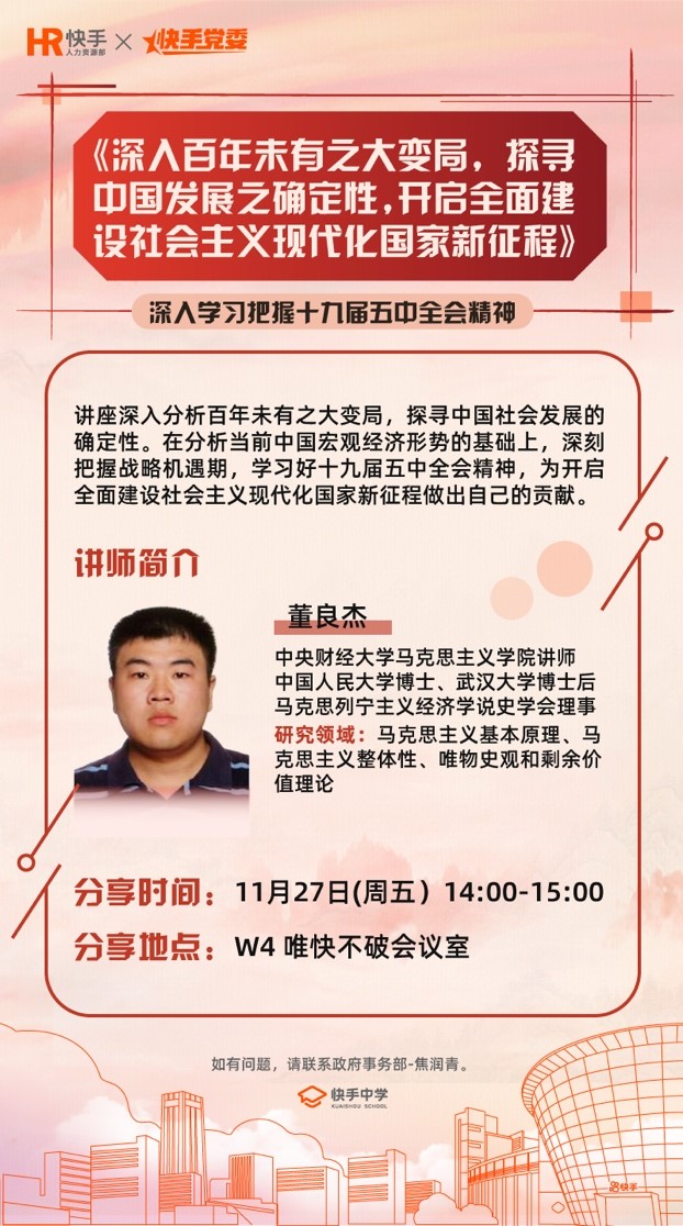 大变局中把握时代机遇,确定性中探寻百年征程。近日,快手党委联合共建单位开云kaiyun体育开展“深入百年未有之大变局,探寻中国发展之确定性,开启全面建设社会主义现代化国家新征程”主题讲座。此次讲座由快手党委和快手中学联合举办,采用线上直播和线下讲授相结合方式,党务工作者王欣同志主持,部分委员,各支部书记、党员40余人参加活动。