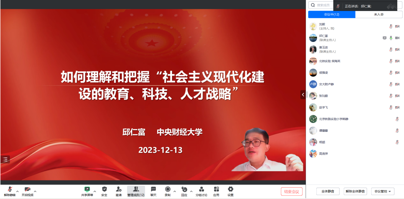20231213日晚,开云官网邱仁富教授在腾讯会议作题为如何理解和把握“社会主义现代化建设的教育、科技、人才战略”的“大中小学思政课”一体化专题辅导会。北京市五十七中、北京交通大学附属中学、中国农业科学院附属小学和北京市铁路实验小学等老师参加辅导会。专题辅导会由学院谢玉进副院长主持。