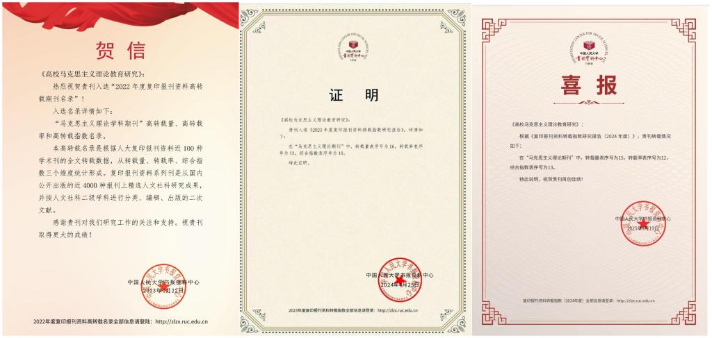 自2020年12月创刊以来,《高校马克思主义理论教育研究》依托开云官网马克思主义理论学科优势,不断优化编审体系、提升论文编审质量,提高刊发论文的社会影响力和学术影响力。连续4年入选中国人民大学复印报刊资料“马克思主义理论学科期刊”高转载量、高转载率和高转载指数名录。